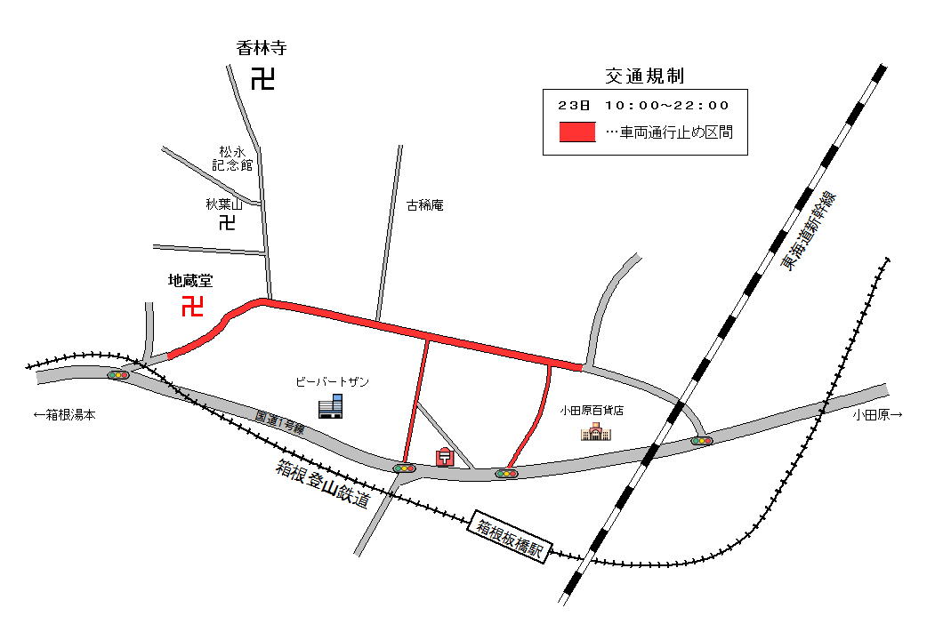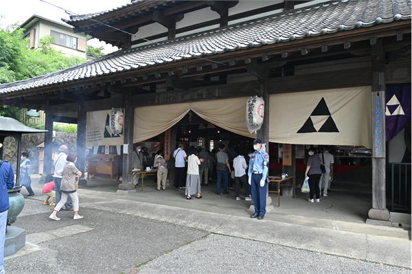 正面中央の列は参拝の列になります。前まで進んでいただくと、大きな赤い提灯(ちょうちん)の裏にお地蔵様の大座像が見えてきます。この座像の腹部には、大祭期間中だけ、秘仏が祀られています。